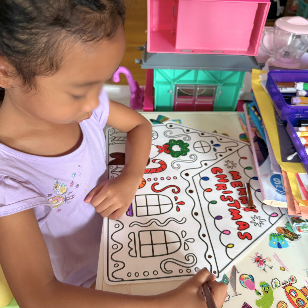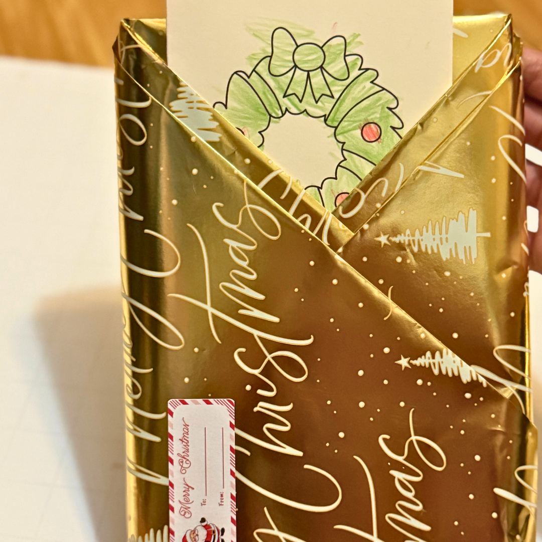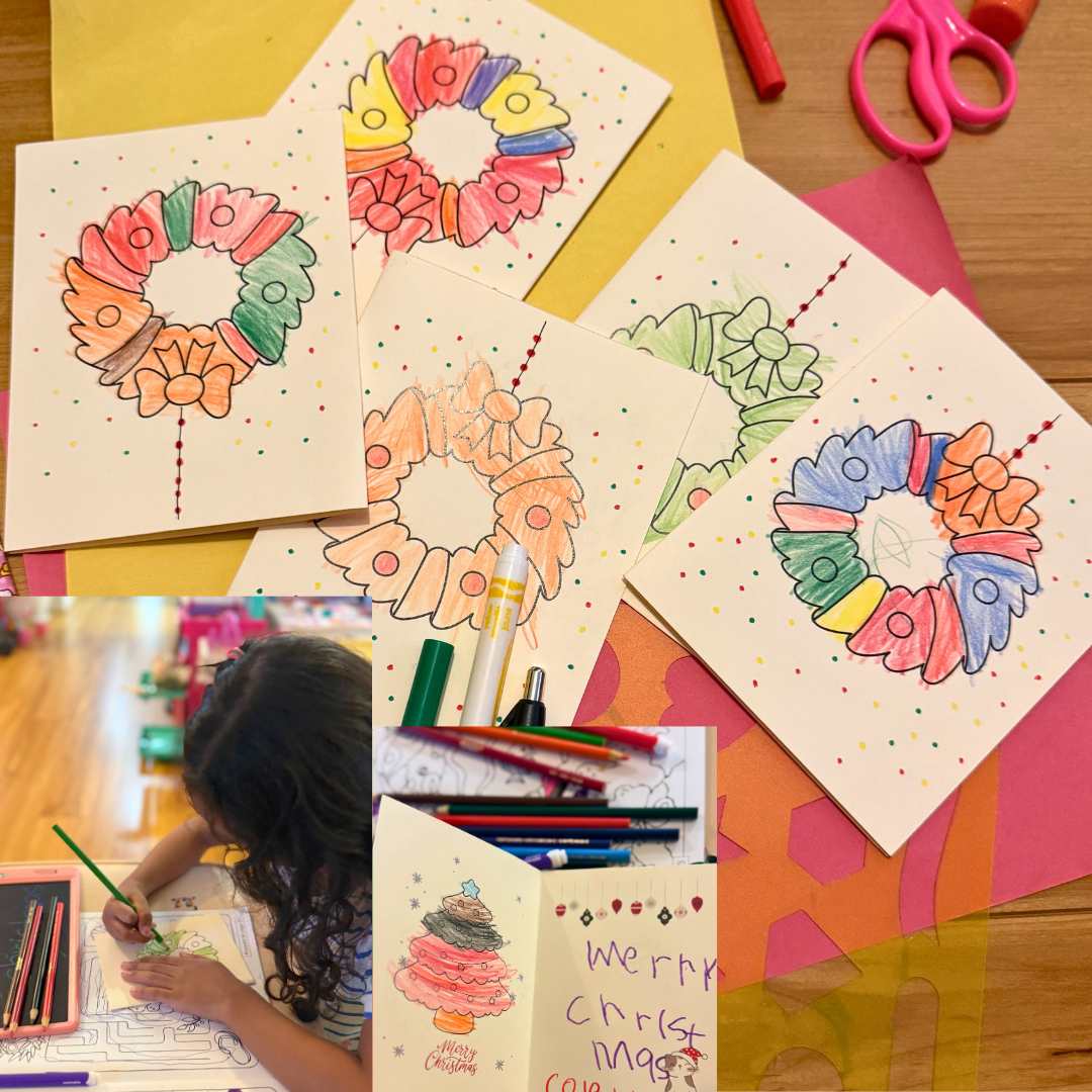 This year, we decided not to send traditional cards but to include them with the gifts, since all her cousins and relatives will be here for Christmas. Instead of buying cards, I designed them on Canva, printed them on cardstock, and let my daughter color and write “Merry Christmas” on each one. It was a fun, personal touch that made the gifts extra special.