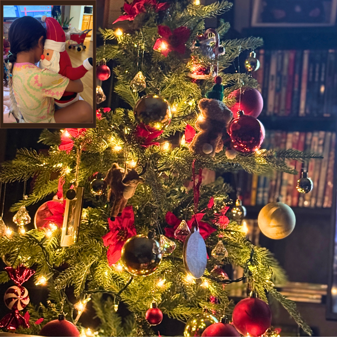 Our first big holiday activity! She helped hang ornaments, fluff the branches, and choose her favorite decorations to display front and center. She’s also been having fun playing with our Santa display, adding even more festive cheer to the living room.