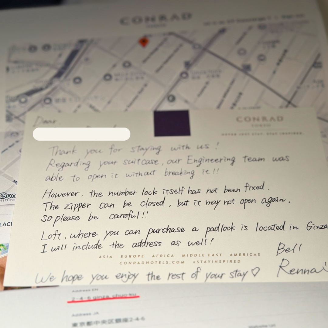 But to my surprise, within a few hours… they managed to open it without damaging my luggage at all! They even wrote a little note when they returned it. That level of care and effort really meant a lot to me. It’s not something you expect, and it just shows how far they go for their guests.