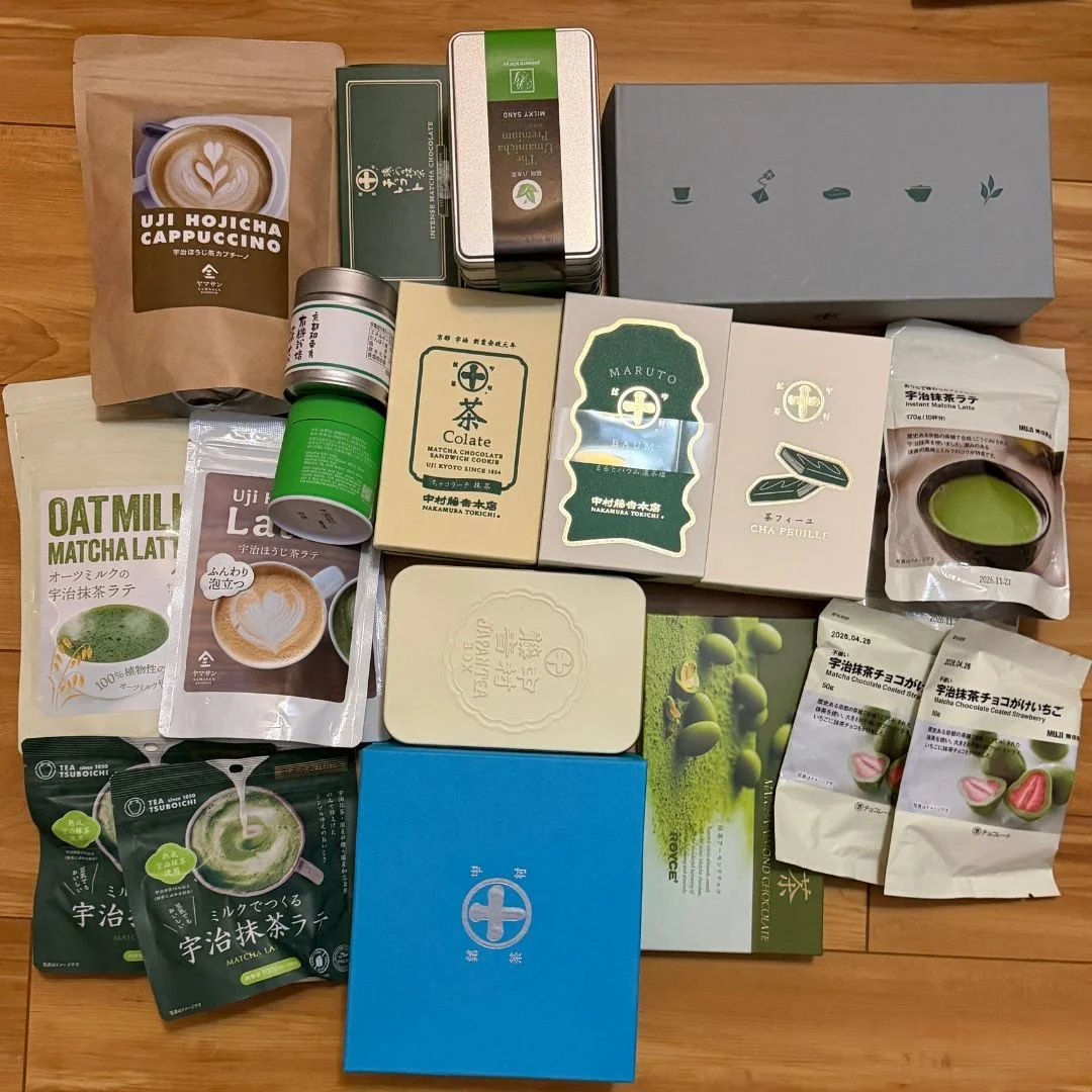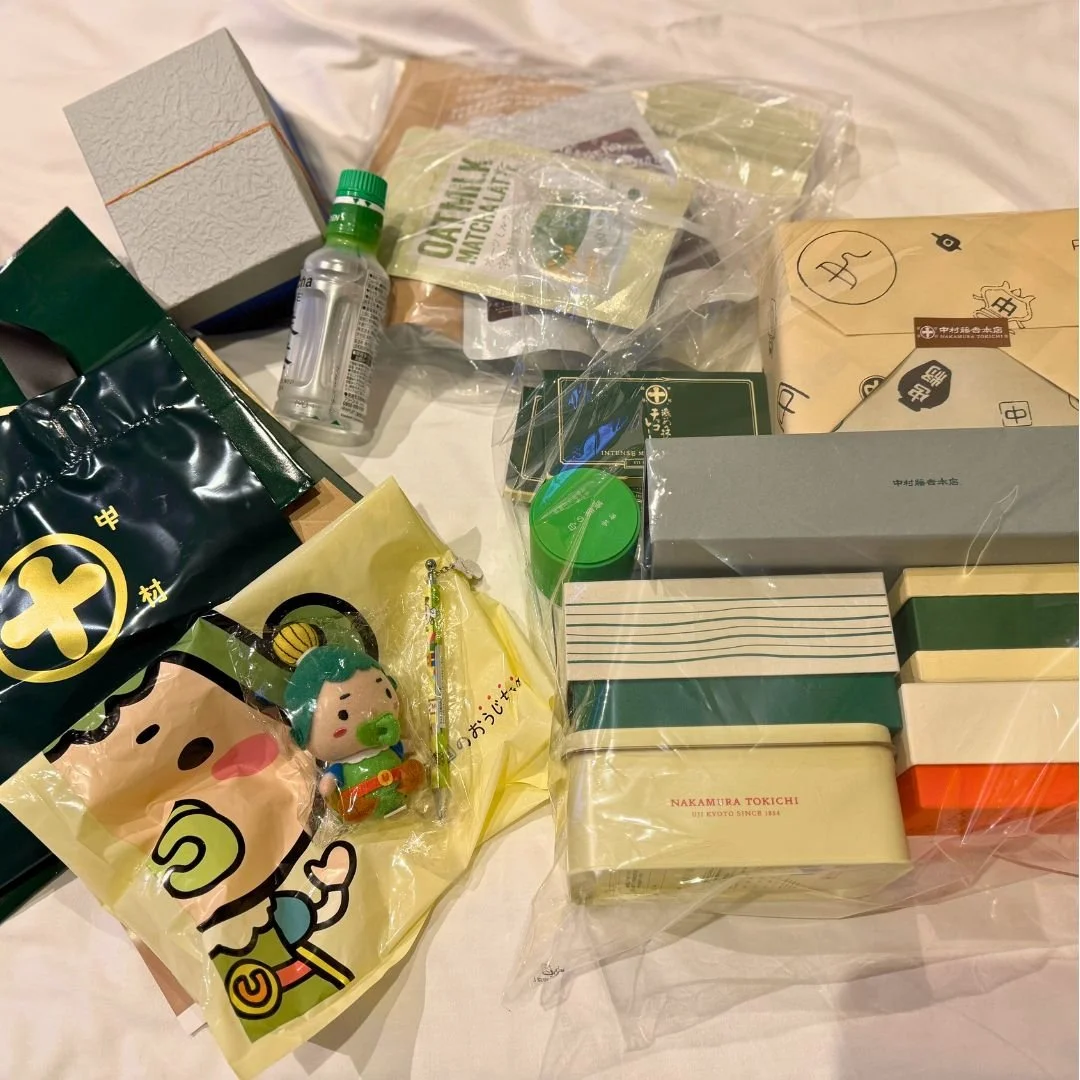 A little Uji matcha haul: pen, keychain, matcha powder, cookies, teas, and a ceramic bowl—perfect souvenirs from our day trip
